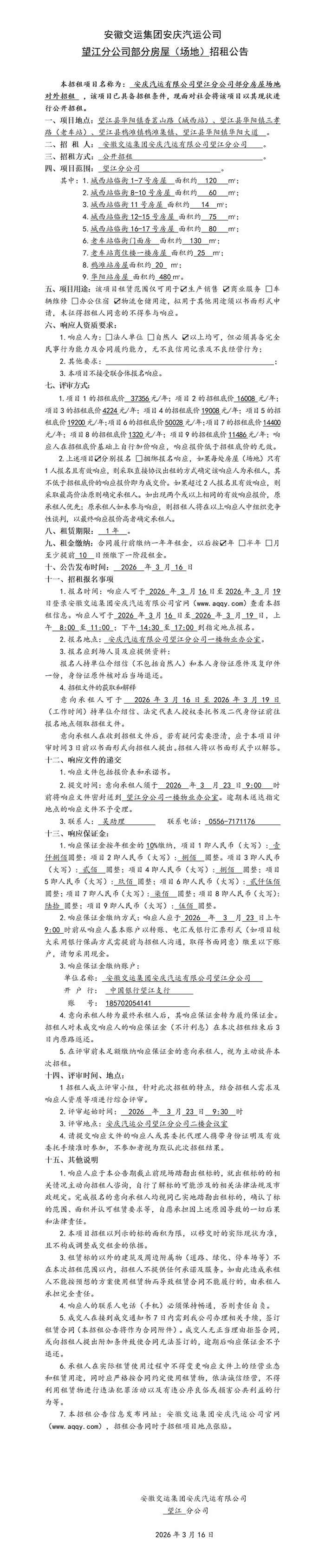 望江分公司部分房屋(場地)招租公告
