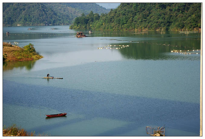 不知過了多久!也不知穿過了多少座隧道!我依然沉浸在遠(yuǎn)離凡塵喧囂的鬧市、相伴于群山峻嶺,四季如春綠油油松柏夾雜著少許紅楓秋葉的幻想之中,間或在轉(zhuǎn)瞬即逝日薄西山的余暉照映下熠熠生輝!此時此刻的我已經(jīng)是到了忘我的最高境界,腦中忽然閃過歐陽老翁的一句至理名言——【醉翁之意不在酒,而在乎山水之間!】這句話用在此處真的是妙不可言!我那萬千思緒隨著飛馳的車輪早已飄到九霄云外,暗自為窗外如畫如詩的景象所迷惑、所陶醉、所依戀...!猛然間聽到一句非常熟悉且溫暖的話——爸爸!快看!到了磨子潭風(fēng)景觀賞區(qū)了!我才恍然如夢驚醒,朝遠(yuǎn)處向下望去好一個一望無際的“磨子潭”!其潭水清澈,魚影可現(xiàn);微風(fēng)襲來,碧波蕩漾;譚中游筏,漁歌互答;這時女兒也詩意助興了!滿懷深情地吟誦——“磨子潭水-深千尺,不及‘爸媽’-送我情!”這句真是太絕了!女兒漸漸地長大了,懂得感恩戴德了。車子終于快要鉆進(jìn)最后一個隧道了,我也不知道它是排第幾?感覺今天好像是專乘“高速隧道”之旅了?!在快要進(jìn)入末了隧道的一霎那,我還特留戀地回頭朝窗外俯視一下,只見磨子潭中那無數(shù)的‘網(wǎng)箱’把整個潭水劃分成大小不等的方塊,好像一張碩大無比殘缺不全的圍棋盤面撒在幽深的譚中,我還來不及細(xì)數(shù)就立刻消失在我難以忘卻的視線中.....!